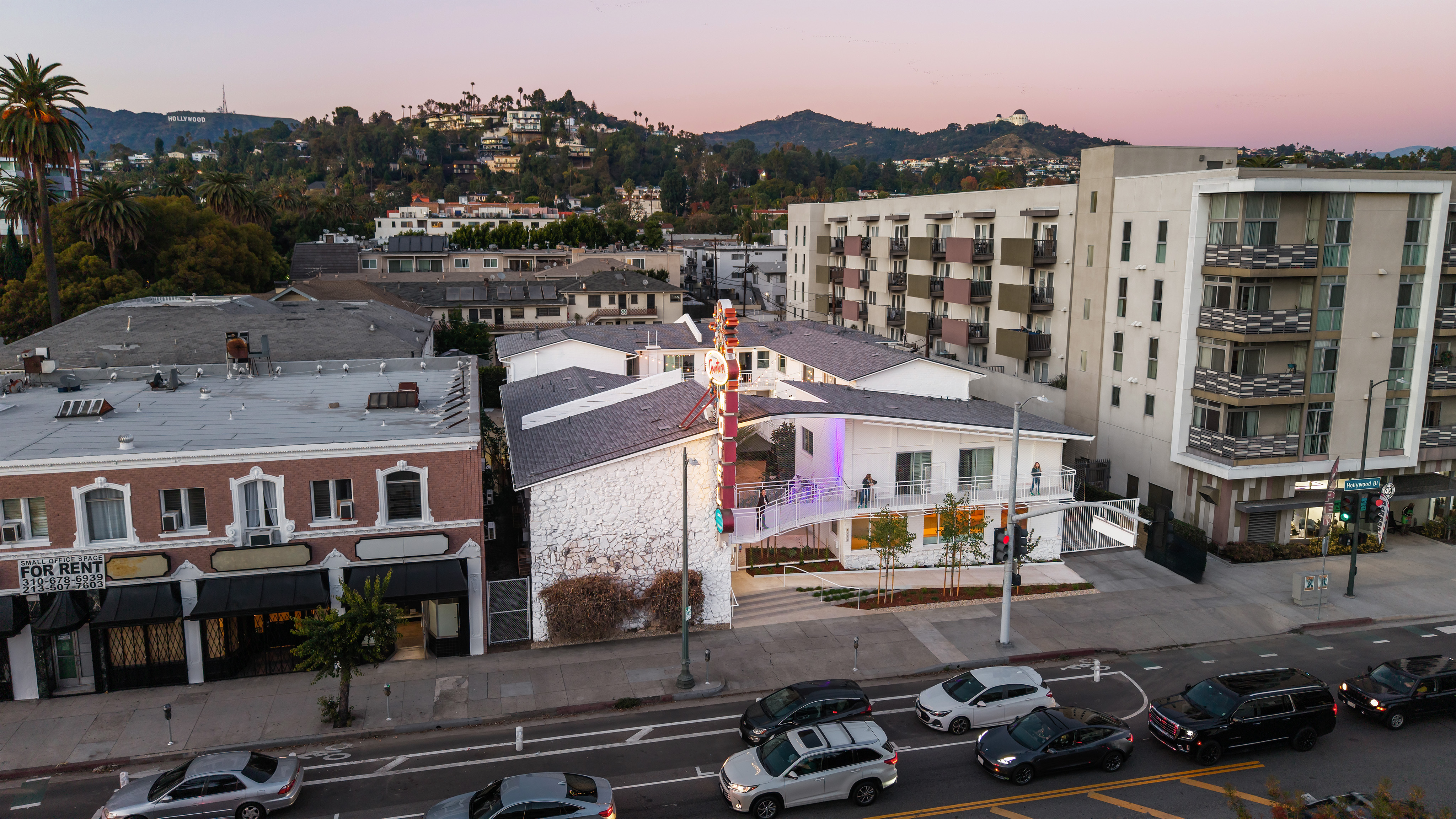 Drawing on its location along Hollywood Boulevard and the site’s historic character including the iconic vintage sign, the design embraces the existing Googie balconies overlooking the street and repurposes the former pool deck into a central garden gathering space. In close collaboration with the historic preservation society, the original stone façade was carefully preserved, even while addressing the challenge of creating an ADA-accessible entry. A gently sloped walkway was introduced with minimal impact on the historic street presence, anchoring the building to the boulevard while framing views of the neon sign and newly netted courtyard.