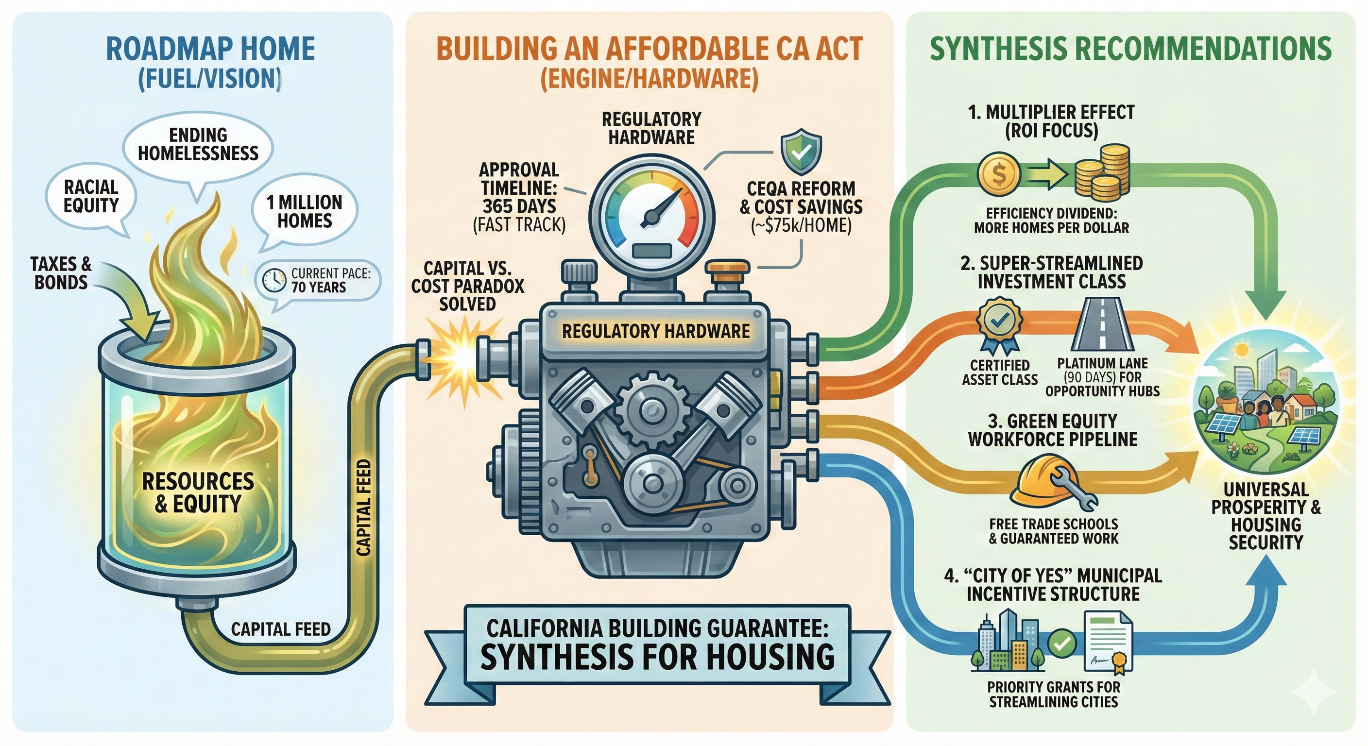 The Alignment: Together, they solve the “Capital vs. Cost” paradox. The Roadmap Home raises the capital needed to subsidize housing, while the Building an Affordable California Act ensures that capital isn’t wasted on bureaucratic delays and legal fees. The Roadmap ensures the right projects are funded (equity/sustainability), and the Act ensures those projects are actually built on a human-relevant timeline.