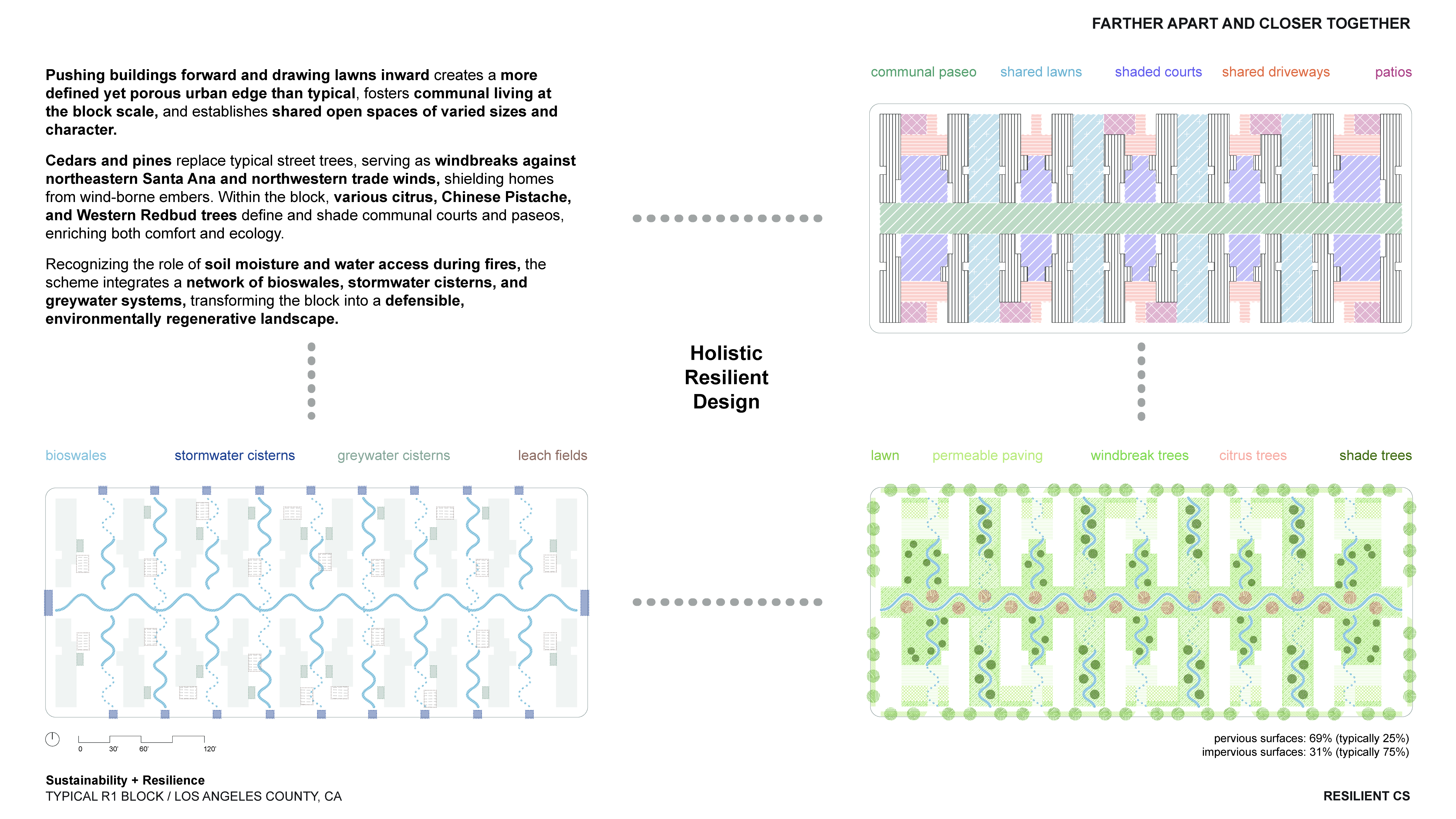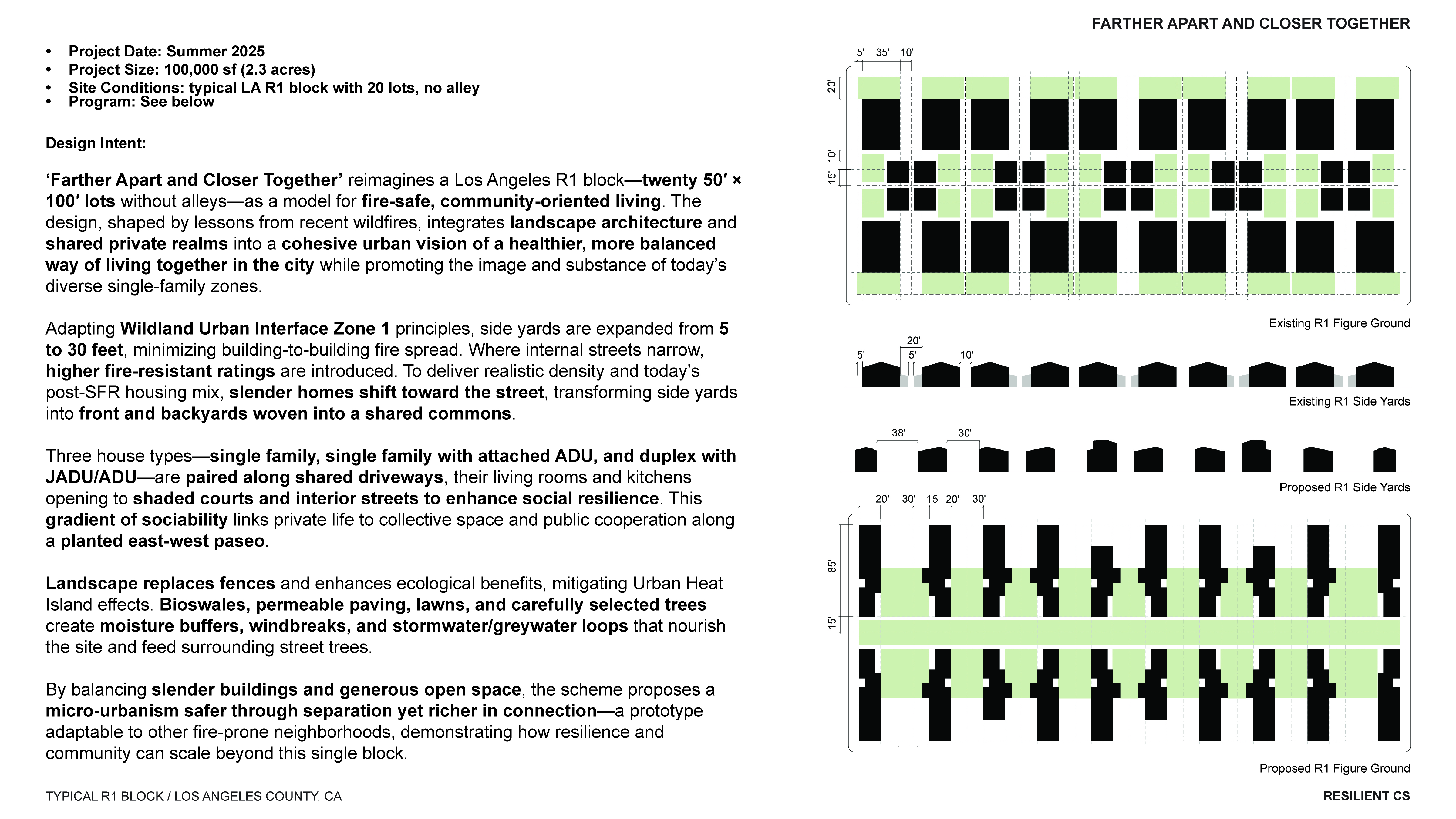 Adapting Wildland Urban Interface Zone 1 principles, side yards are expanded from 5’ to 30’ to minimize building-to-building fire spread. Where internal streets narrow, higher fire-resistant ratings are introduced. To deliver realistic density and today’s post-SFR housing mix, slender homes shift toward the street, transforming side yards into front and backyards woven into a shared commons. Pushing buildings forward and drawing lawns inward creates a more defined yet porous urban edge than typical, fosters communal living at the block scale, and establishes shared open spaces of varied sizes and character. So, the trade-off is: expand the side and rear yards by minimizing the front yards, and allow R1 zones to house 3-story buildings.