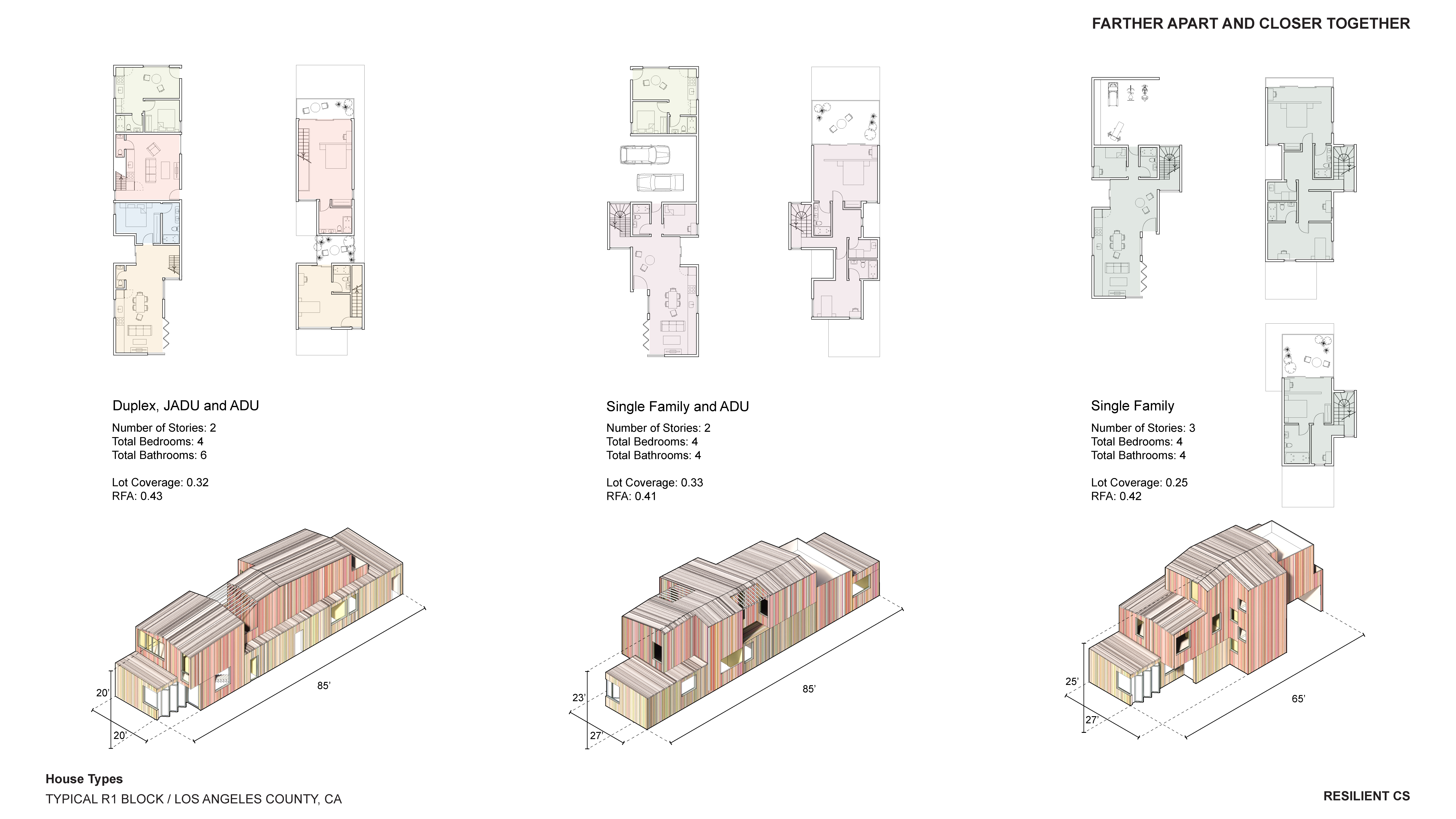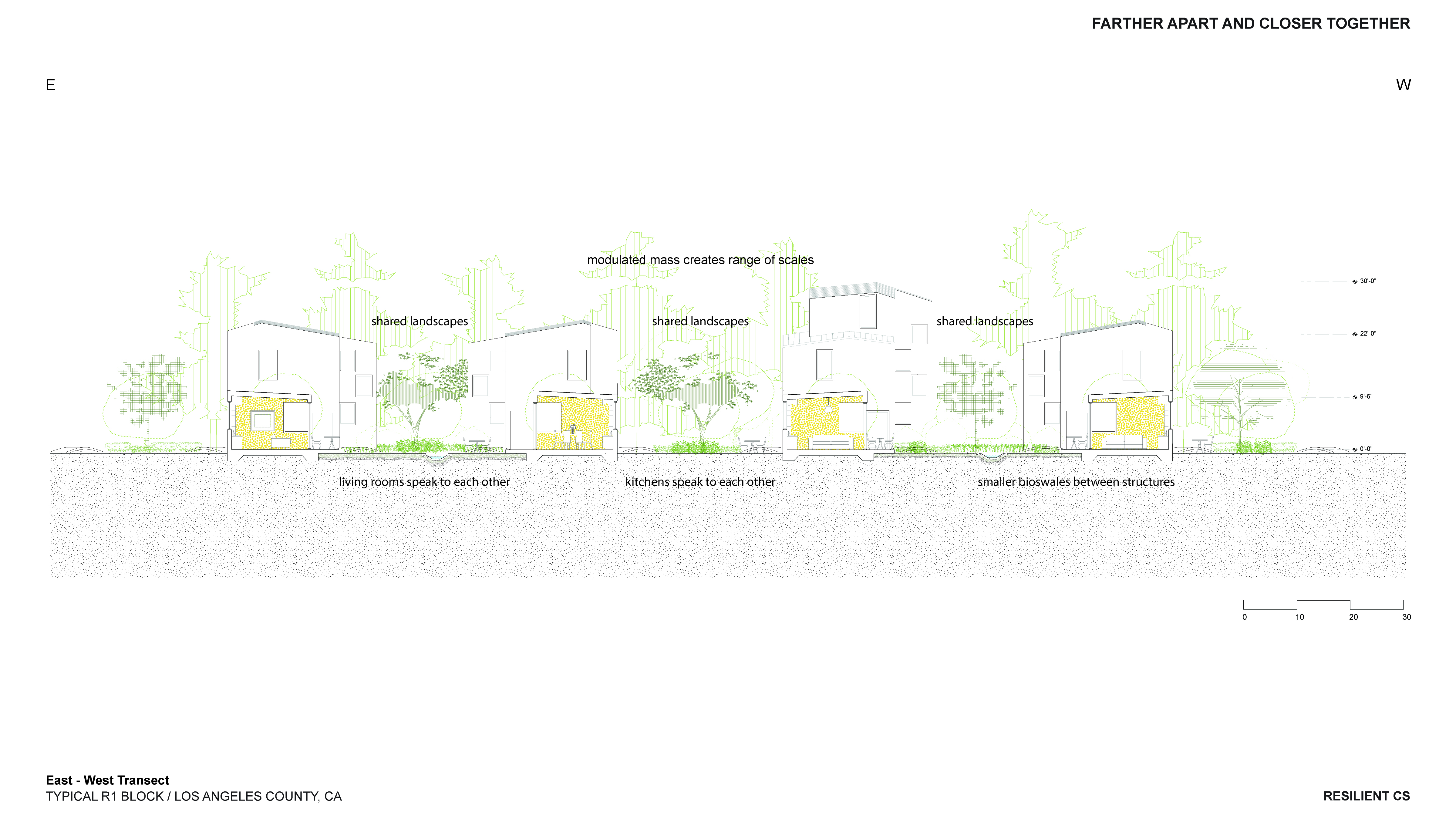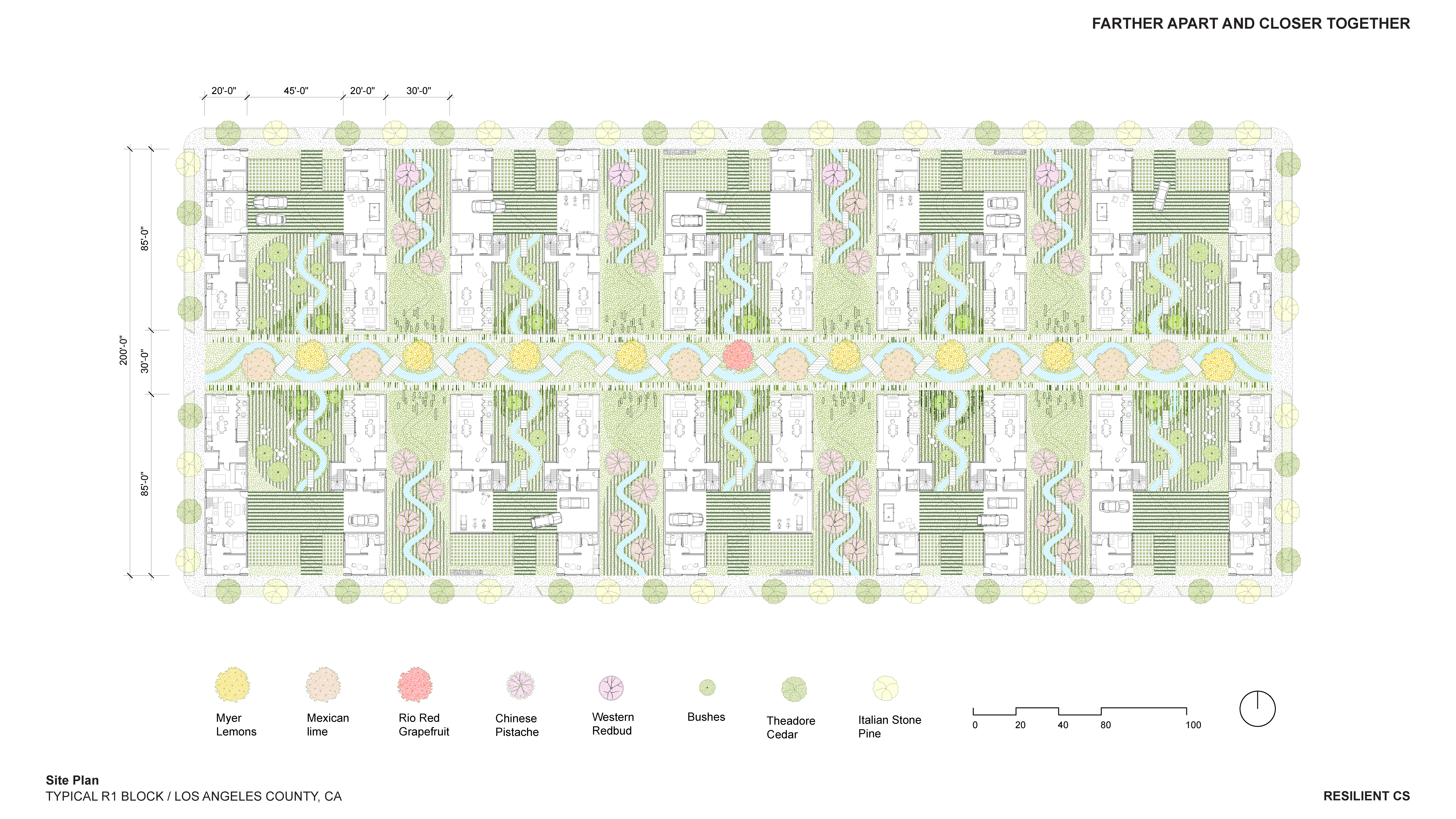 ‘Farther Apart and Closer Together’ was developed holistically and integratively in collaboration with Professors Dana Cuff and Stephanie Landregan, who provided indispensable wisdom and feedback on the Public and Landscape Architecture dimensions of the work. In the seminar, the students developed a hypothetical, yet super-plausible, project for a Los Angeles R1 block comprising twenty 50′ x 100′ lots without alleys, serving as a model for fire-safe, community-oriented living.