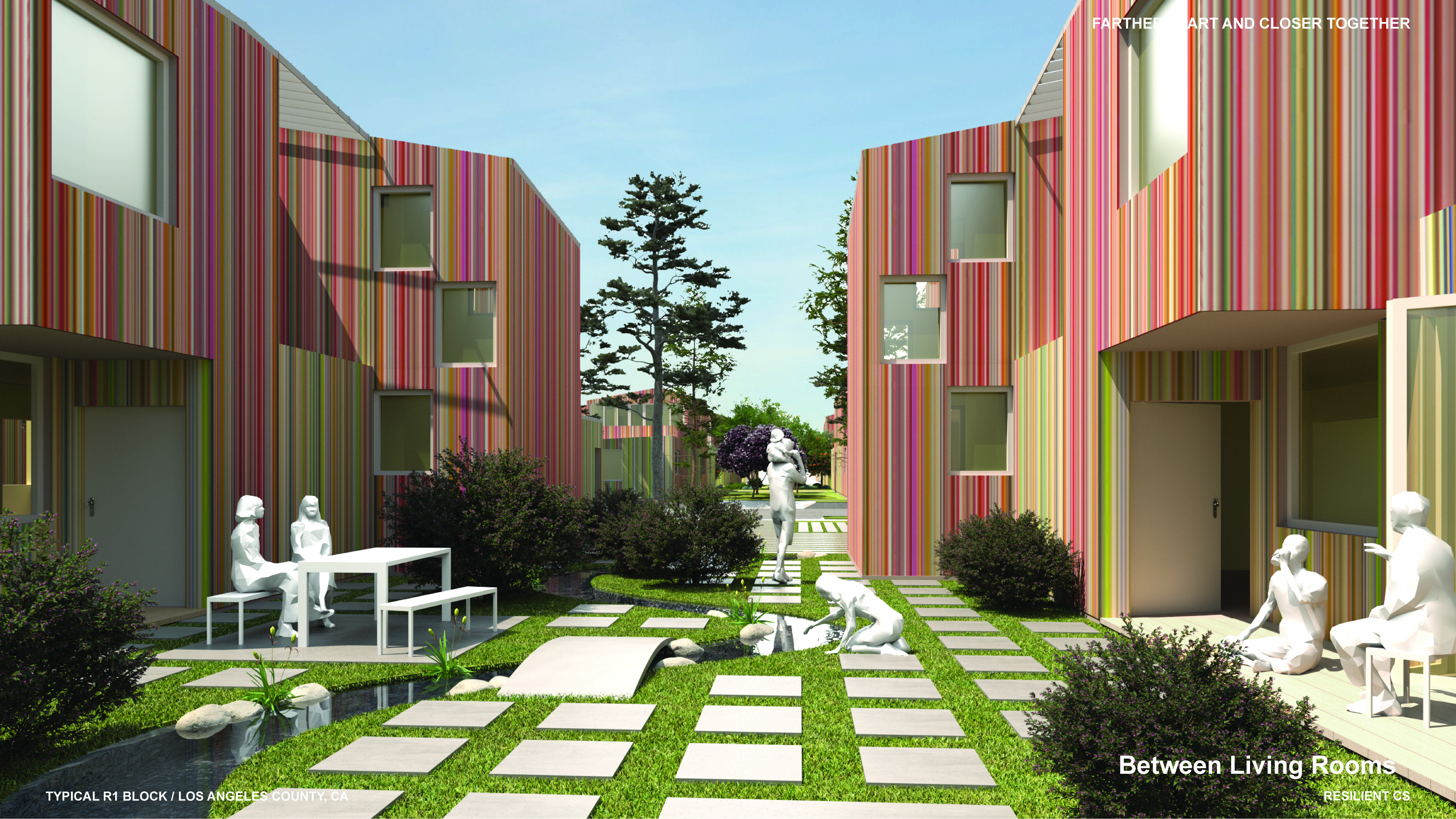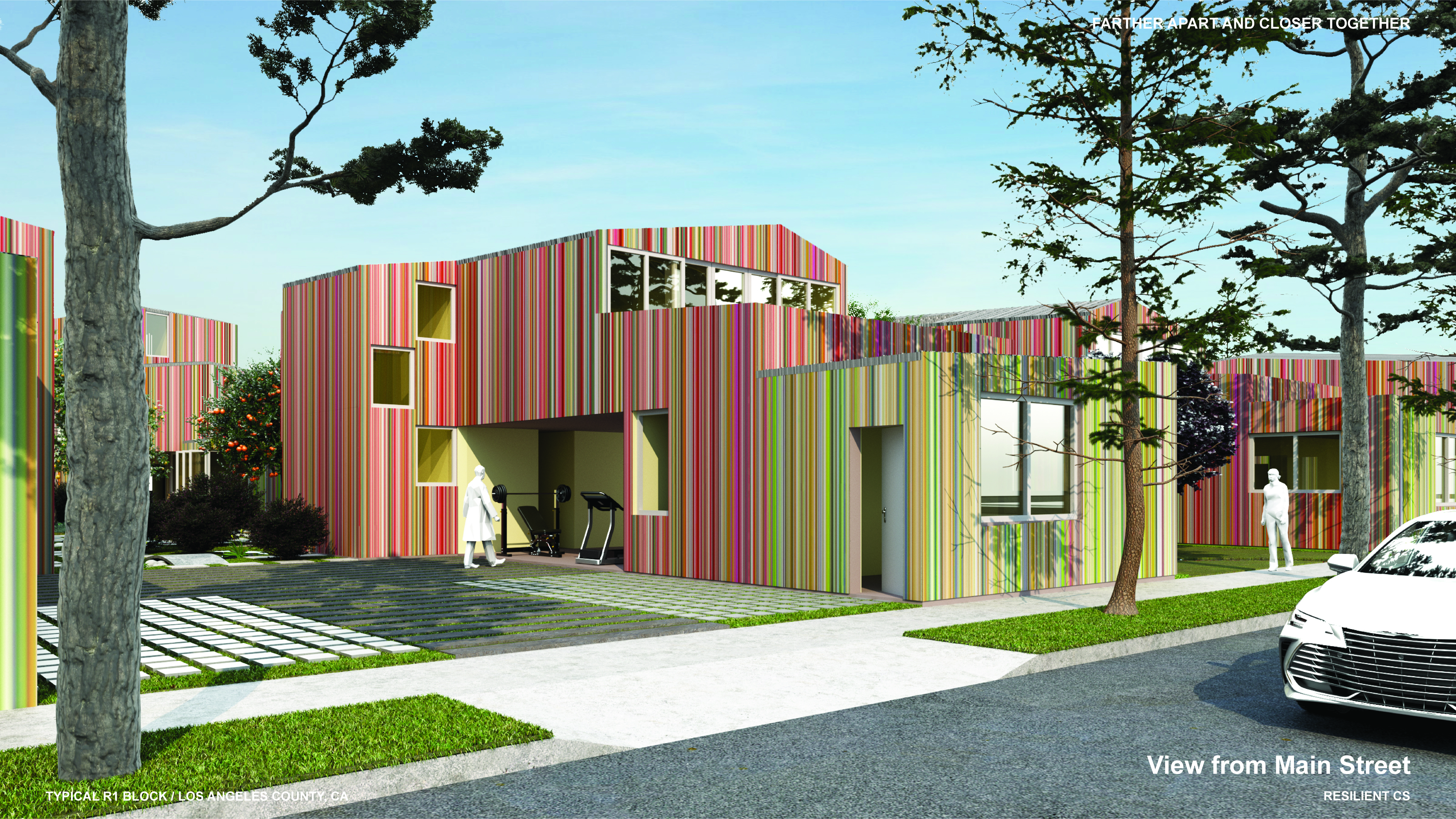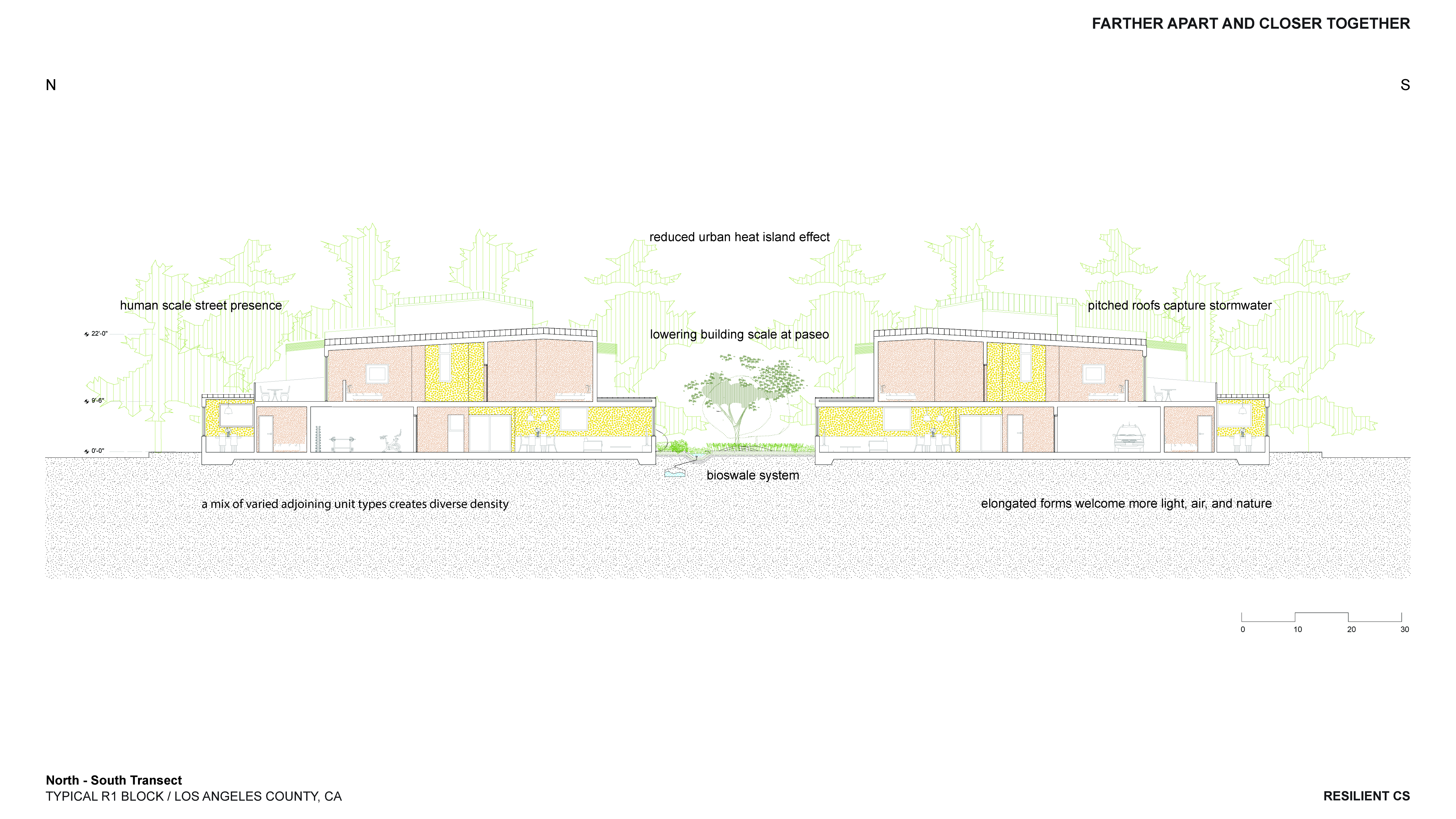 ‘Farther Apart and Closer Together’ was developed holistically and integratively in collaboration with Professors Dana Cuff and Stephanie Landregan, who provided indispensable wisdom and feedback on the Public and Landscape Architecture dimensions of the work. In the seminar, the students developed a hypothetical, yet super-plausible, project for a Los Angeles R1 block comprising twenty 50′ x 100′ lots without alleys, serving as a model for fire-safe, community-oriented living.